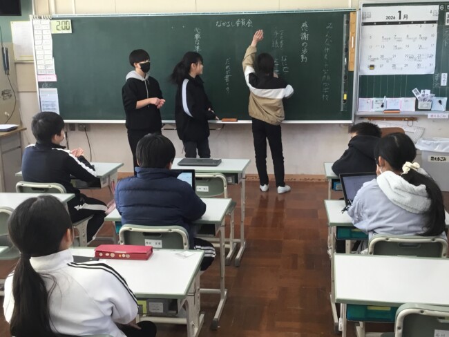どうやって感謝を伝えようか… 2026/01/23 感謝・準備のステージに入って最初の委員会活動。それぞれの委員会で話し合われたのは「感謝をどのように伝えるか」です。感謝を伝える相手は、なかよし委員会=地域のボランティアさん、健康委員会=学校全体(校舎など)、環境委員会=給食のボランティアさん、図書委員会=読み聞かせボランティアさん・司書さん、イベント委員会=全校のみんな、放送委員会=全校のみんな、になっています。さて、どのような伝え方が一番感謝の思いが伝わるのかな。