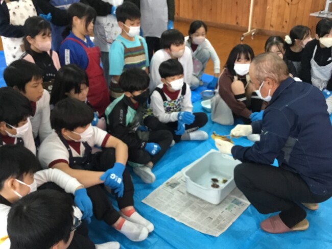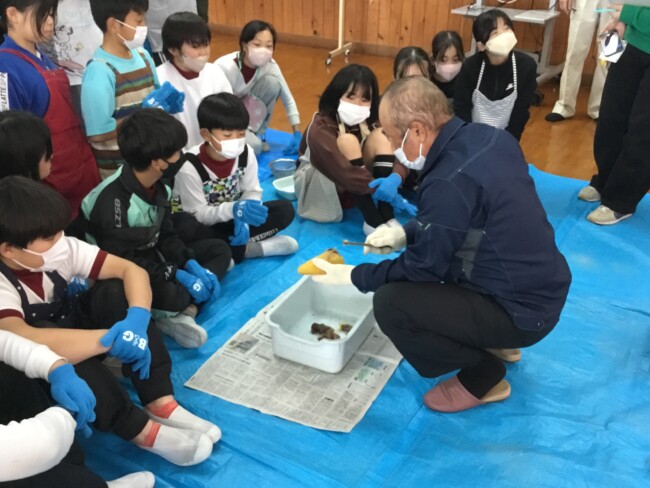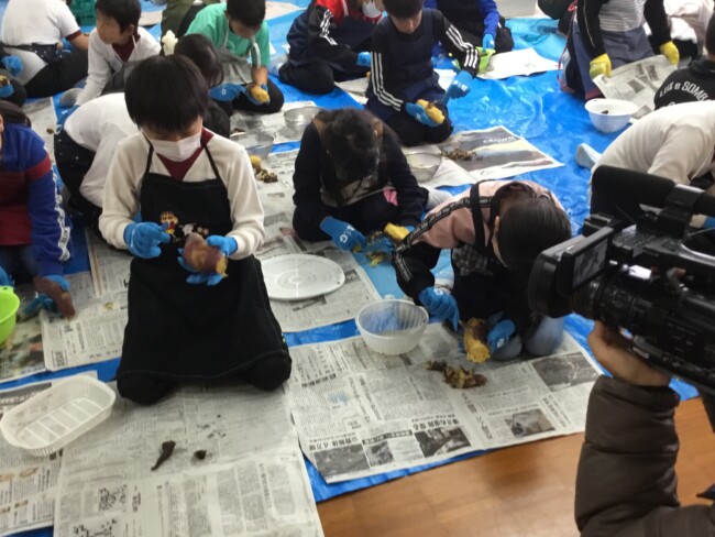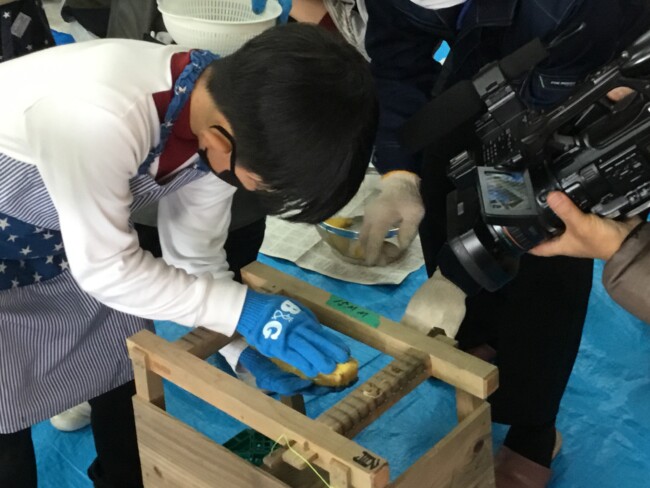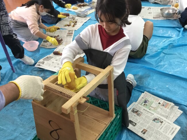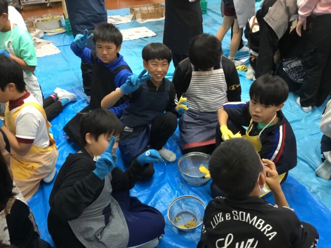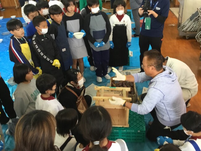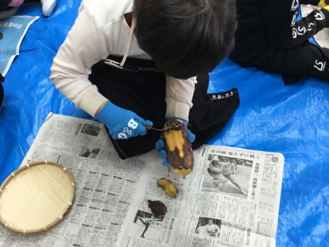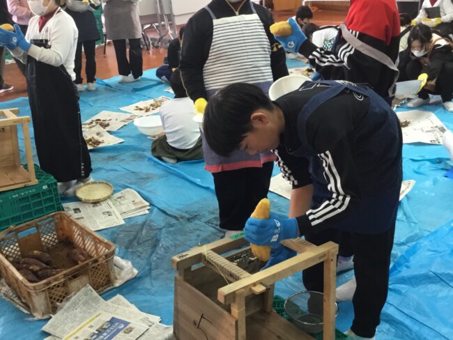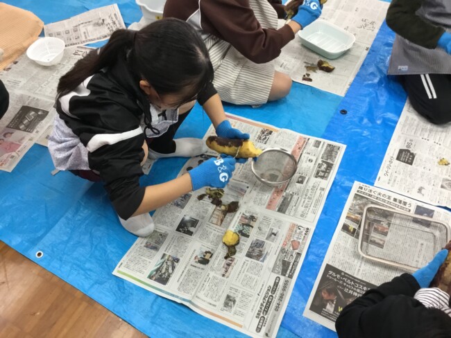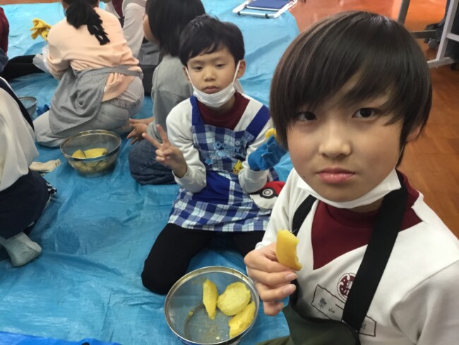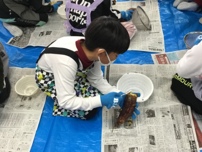 「干芋プロジェクト」に取り組んでいる5年生。自分たちで育てたさつまいもを、いよいよ干芋にするときがきました。副市長をはじめ、市役所総務課の方々や「干芋」の専門家である沖さん・二俣さんにお越しいただき、干芋づくりにチャレンジしました。寒風で干して甘みを増したおいもがもう少しで食べられますね。