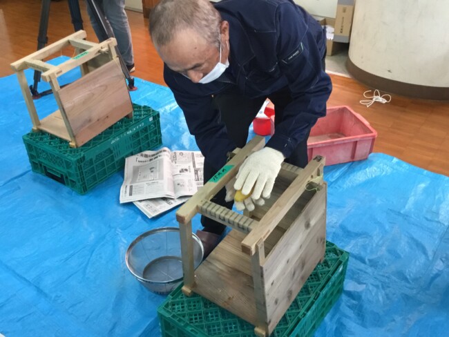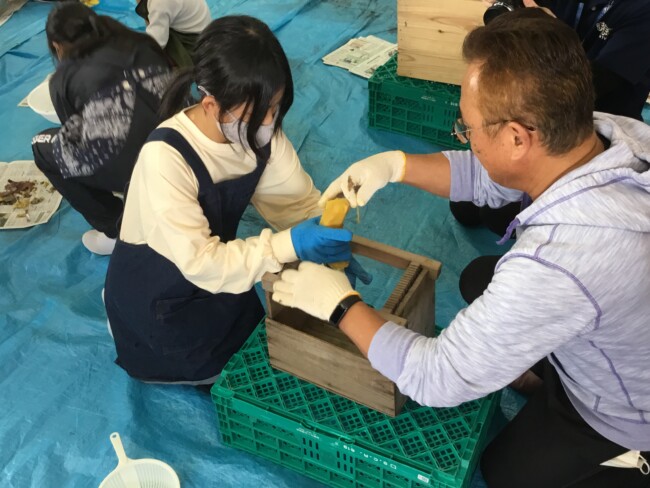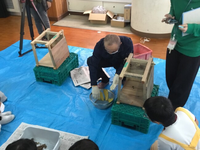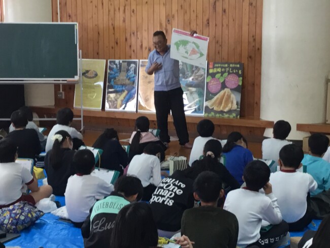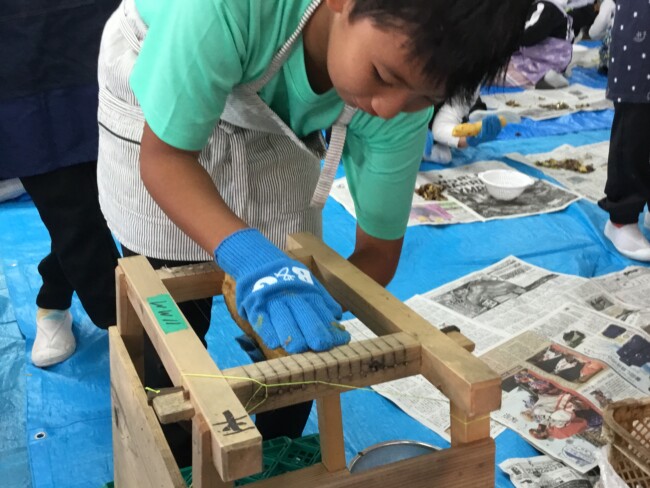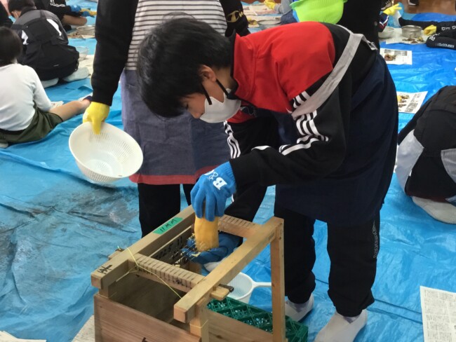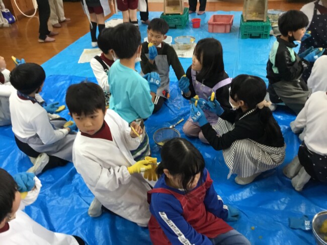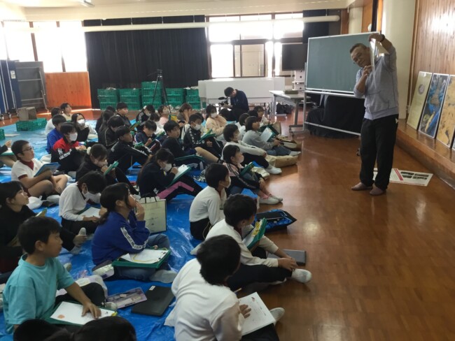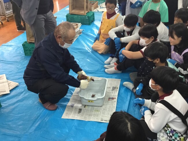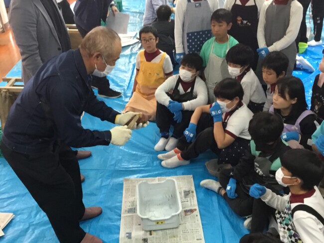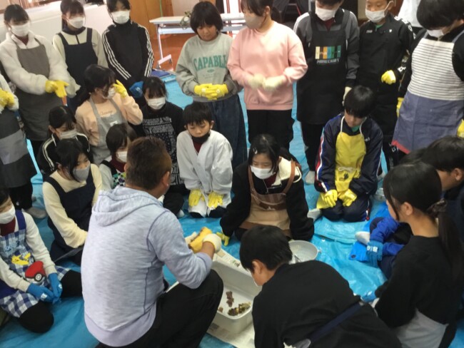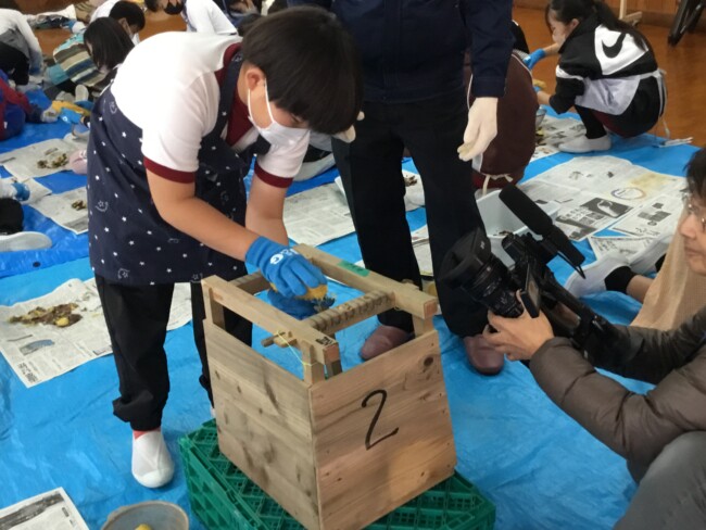 「干芋プロジェクト」に取り組んでいる5年生。自分たちで育てたさつまいもを、いよいよ干芋にするときがきました。副市長をはじめ、市役所総務課の方々や「干芋」の専門家である沖さん・二俣さんにお越しいただき、干芋づくりにチャレンジしました。寒風で干して甘みを増したおいもがもう少しで食べられますね。
