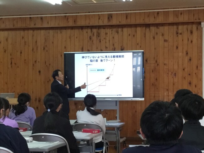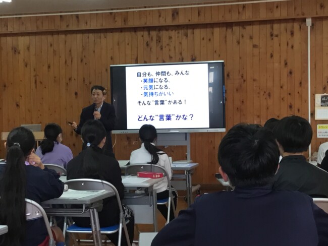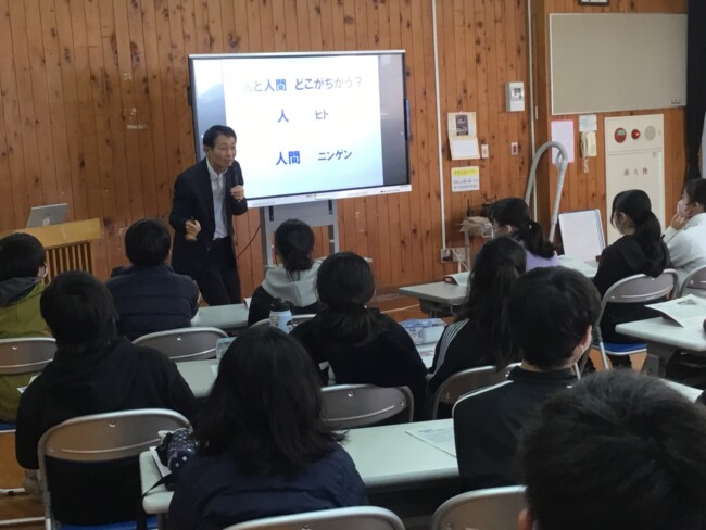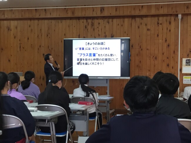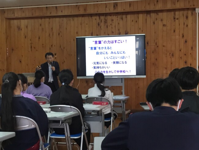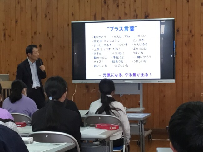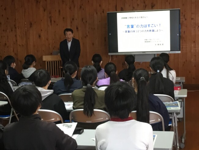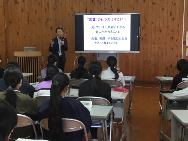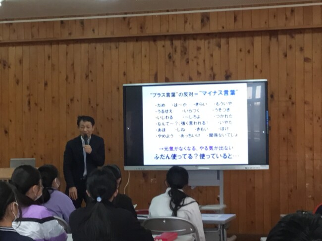 毎年、6年生に「言葉のもつ力」についてお話していただいている静岡新聞の谷沢さんが今年も来てくださいました。谷沢さん6年生に伝えたかったこと、それは「プラス言葉をたくさん使おう」ということ。「夢を叶えるにはプラス言葉を使うこと」なぜなら「叶」という漢字は「口」に「プラス」だから・・・。自分の口からプラスの言葉を出すことで、自分にはやる気がわき、相手も気持ちよくなり夢の実現に近づいていきます。逆に相手を傷つけてしまう「マイナス言葉」は、相手に言う前に自分の頭で考える分、言う人がよりマイナス言葉を聞くことになるともおっしゃられていました。マイナス言葉を言っていると、どんどん心が荒んでいくので使わないようにしたいですね。さあ、これからはたくさんプラス言葉を使っていきましょう。
