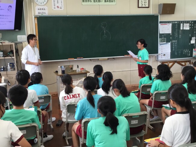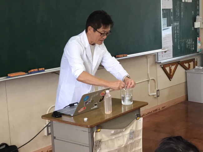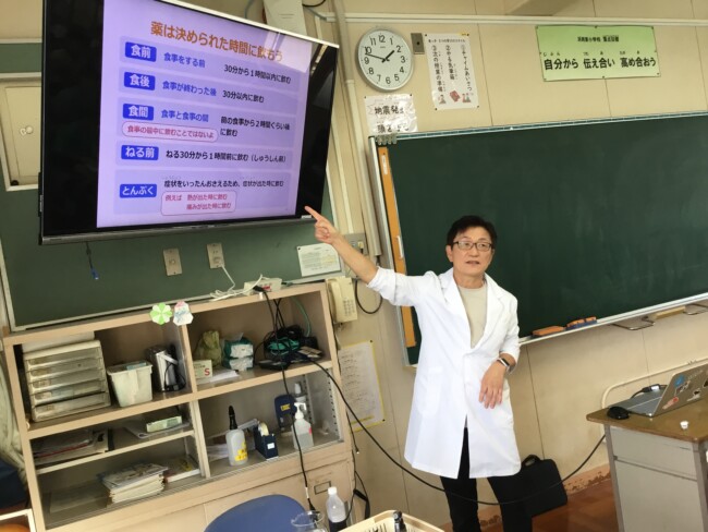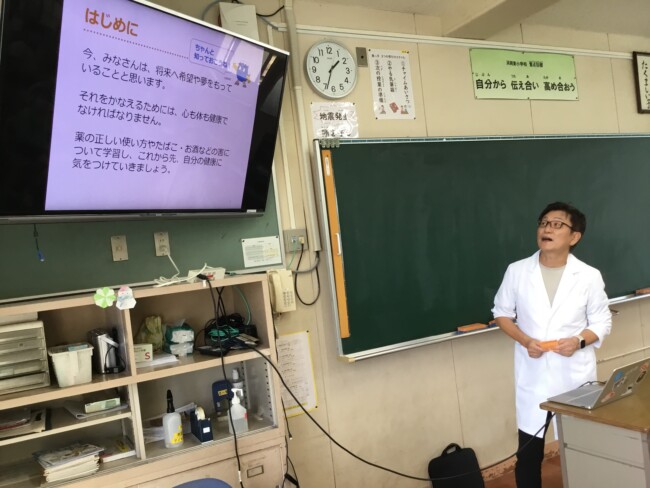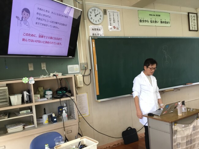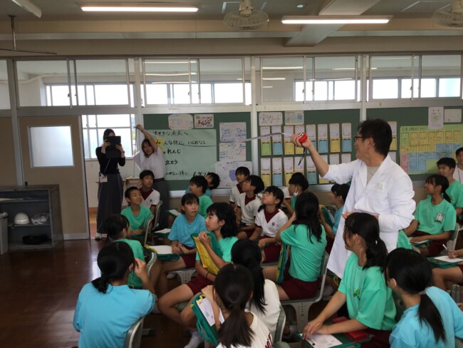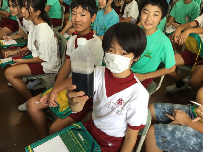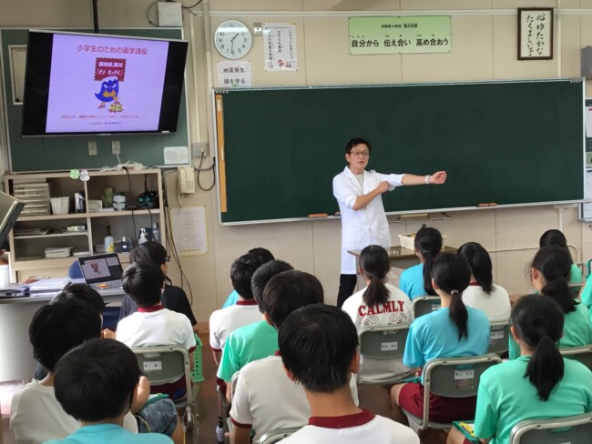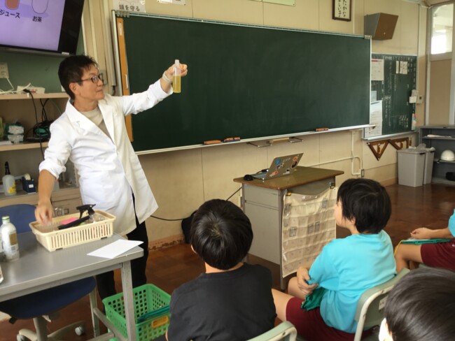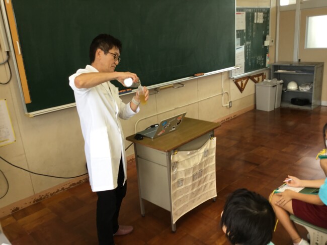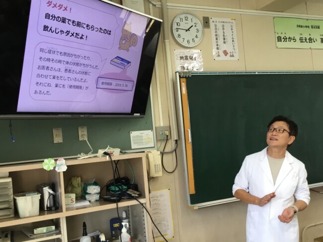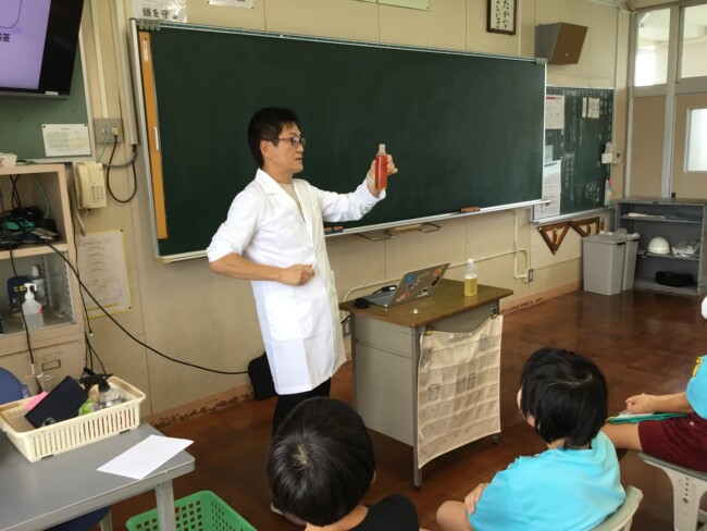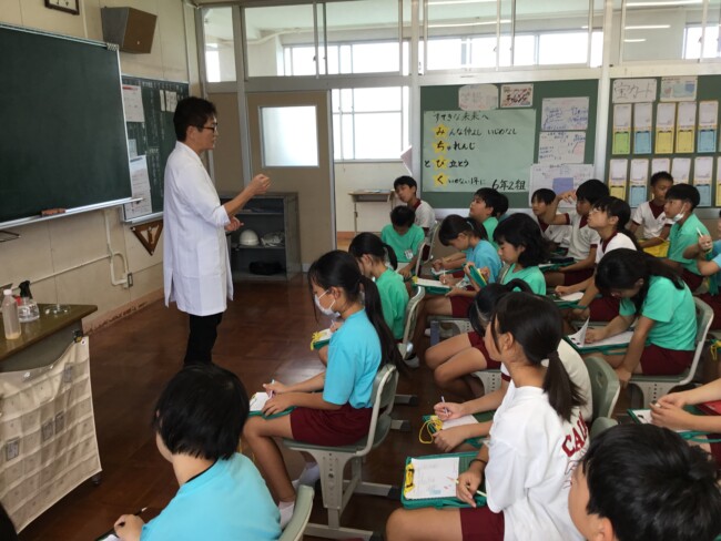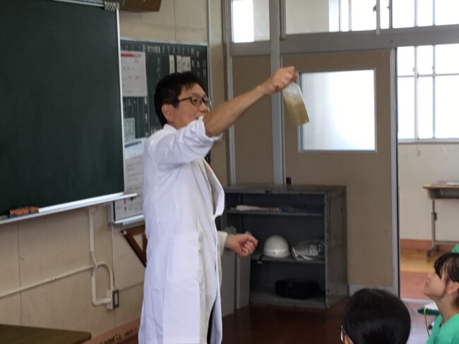 もうすぐ楽しいお祭りです。今日はそのお祭りを前に、6年生を対象に「薬学講座」が開かれました。「薬の正しい飲み方」や「お酒やたばこの害」、「薬物乱用」について学校薬剤師の澤入先生に御指導いただきました。特に、薬の正しい飲み方については、「お茶」や「ジュース」で飲んだらどうなるか、を実験を交えてお話してくださいました。お茶は、しばらくすると「真っ黒に…。」衝撃的な結果に6年生も目が点になっていました。お祭りではお酒を飲んでる大人の人がたくさんいます。誘われても飲まないように気をつけましょう。