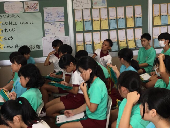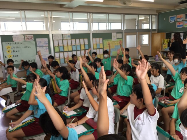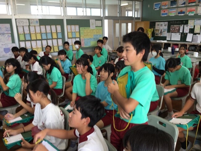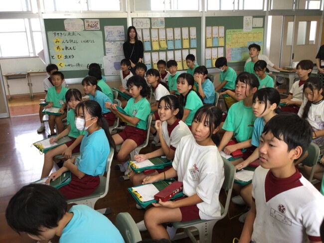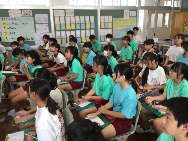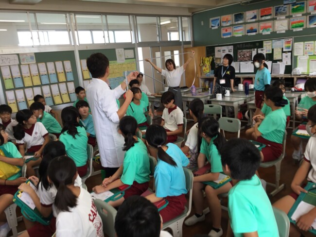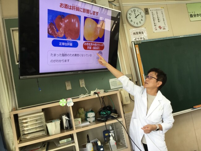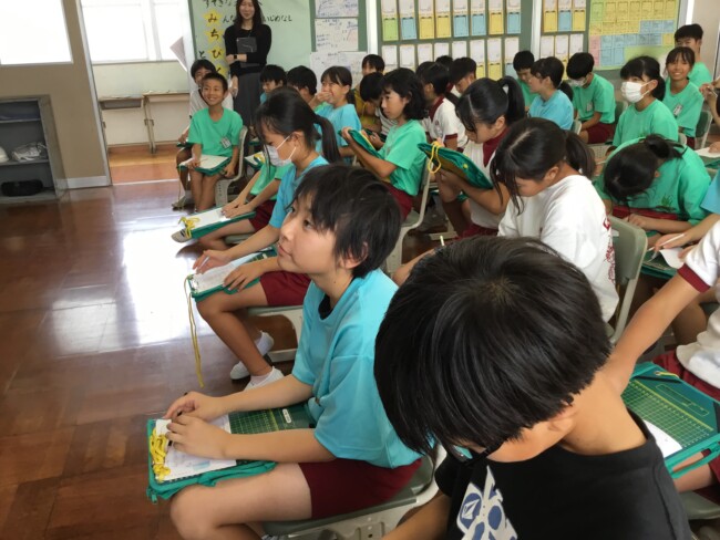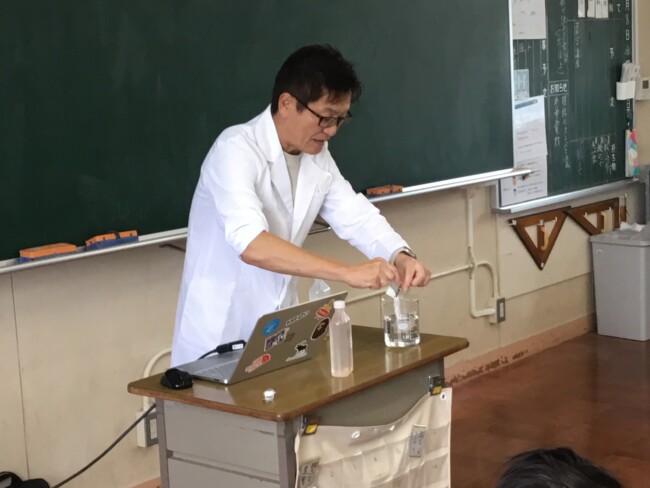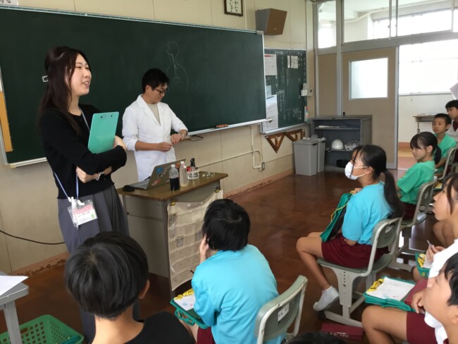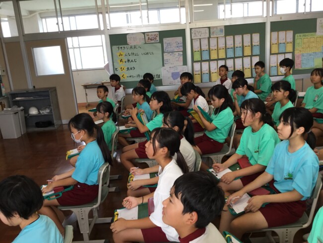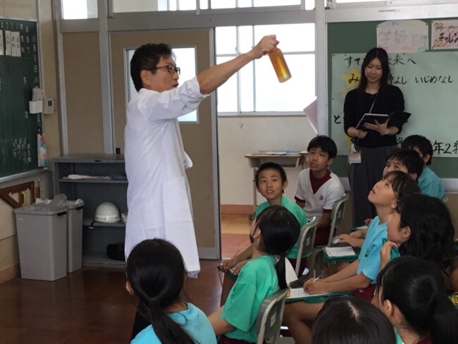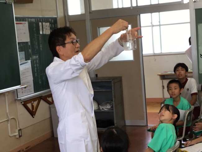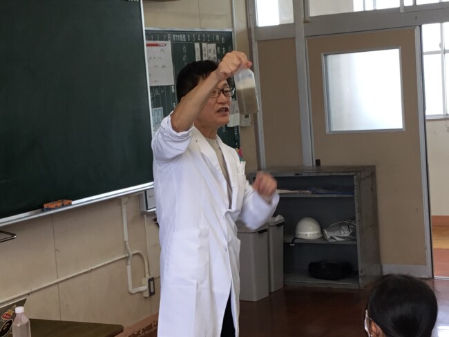 もうすぐ楽しいお祭りです。今日はそのお祭りを前に、6年生を対象に「薬学講座」が開かれました。「薬の正しい飲み方」や「お酒やたばこの害」、「薬物乱用」について学校薬剤師の澤入先生に御指導いただきました。特に、薬の正しい飲み方については、「お茶」や「ジュース」で飲んだらどうなるか、を実験を交えてお話してくださいました。お茶は、しばらくすると「真っ黒に…。」衝撃的な結果に6年生も目が点になっていました。お祭りではお酒を飲んでる大人の人がたくさんいます。誘われても飲まないように気をつけましょう。