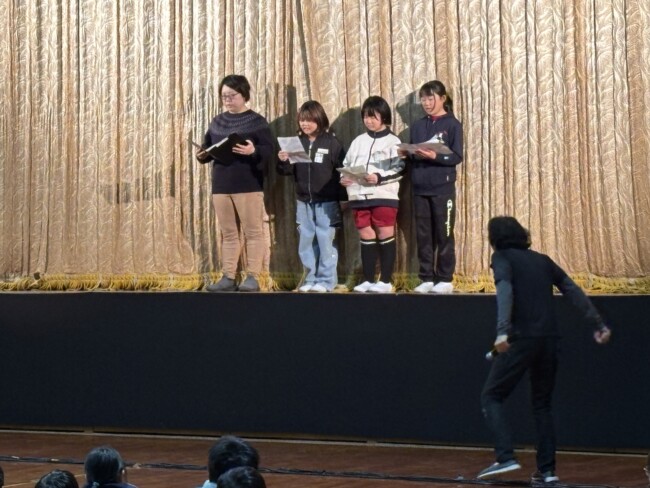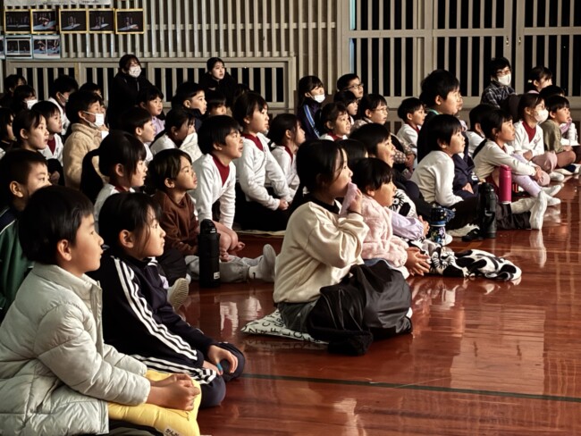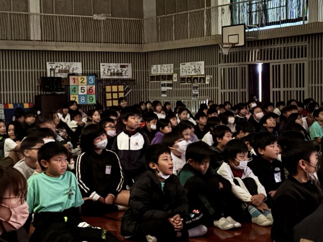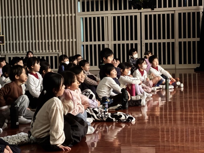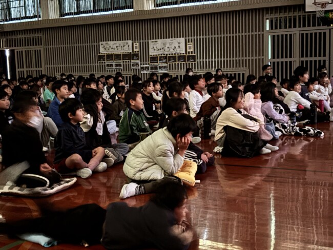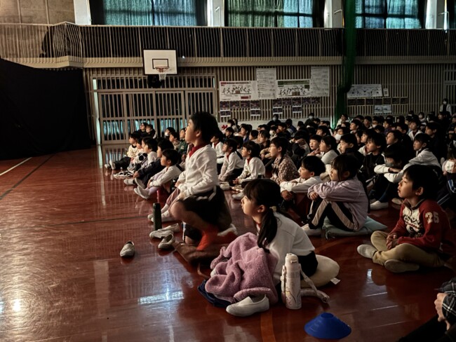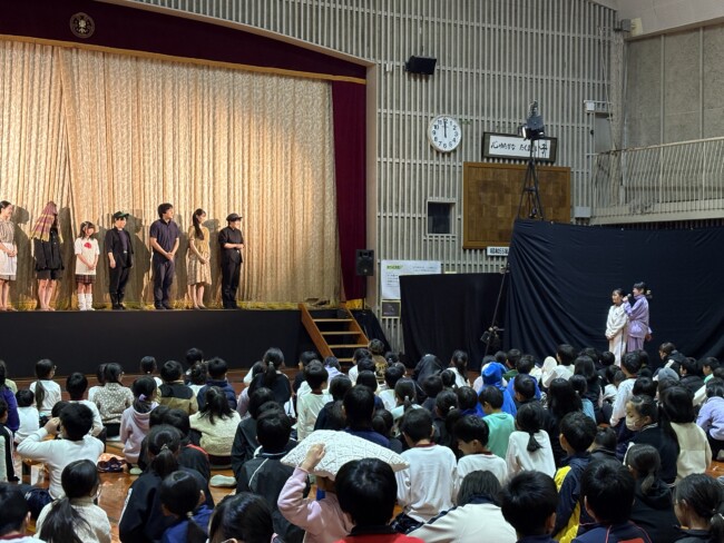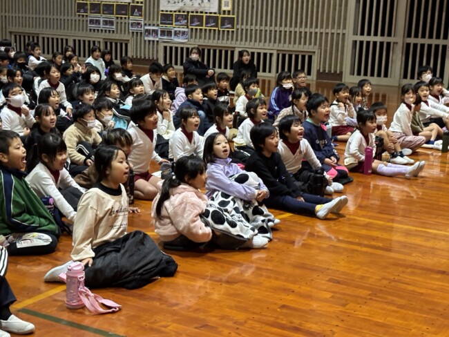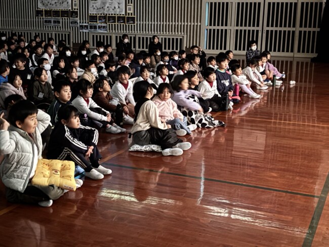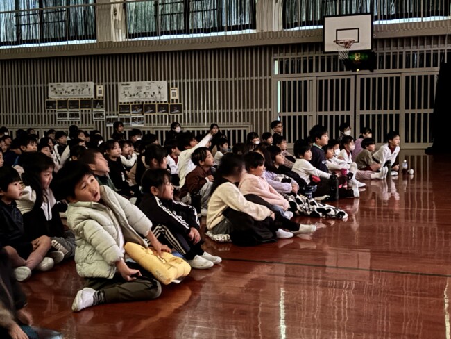 みんな大興奮 2025/11/26 インフルエンザの大流行により延期となっていた観劇が行われました。「雨降り小僧」主人公の「もうた」と妖怪の「雨降り小僧」のお話でした。児童の代表が劇の予告を朗読し、その中の1名は役者として劇にも出演しました。1年生を中心に、身を乗り出し、目を輝かせて見入っていました。年に一度の観劇ですが、お話の世界に入り込める体験はやっぱり貴重なものでした。