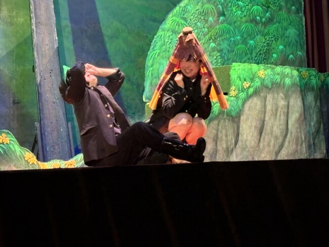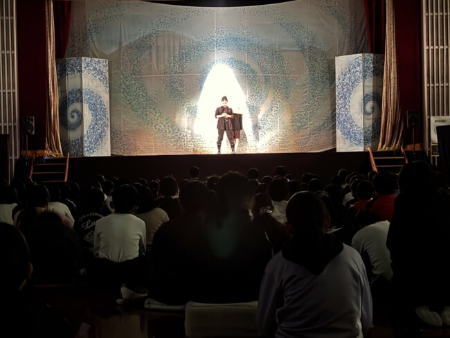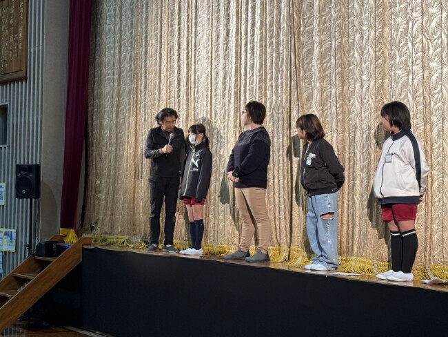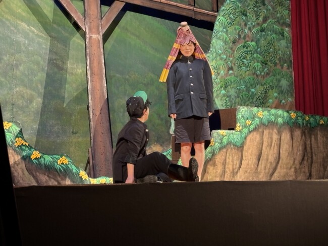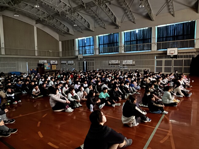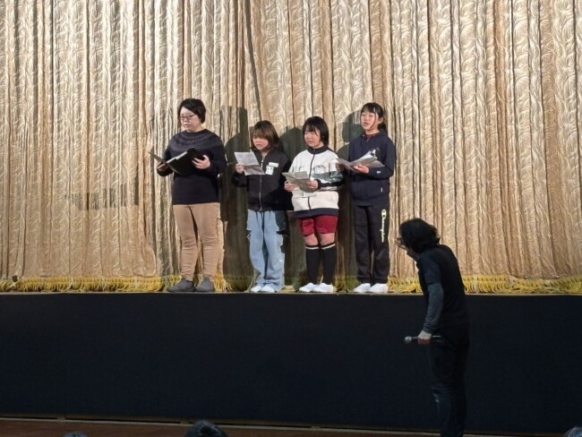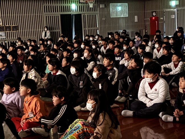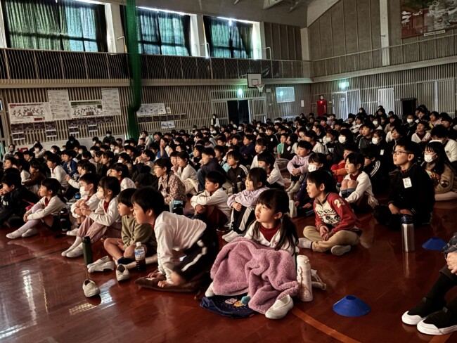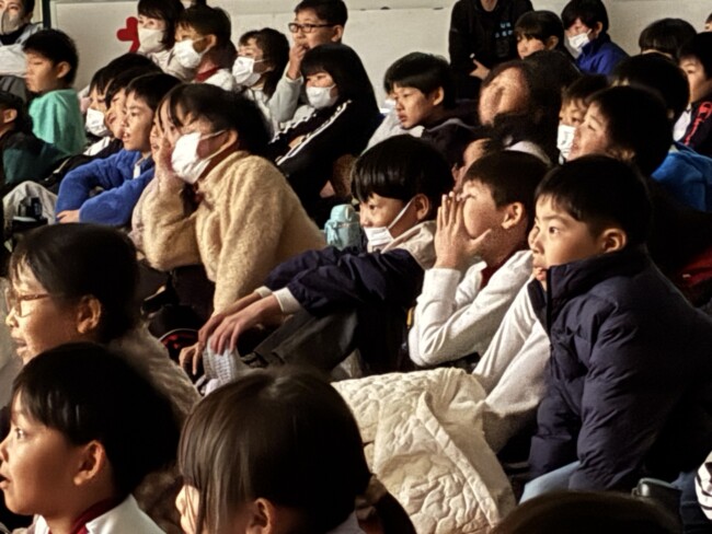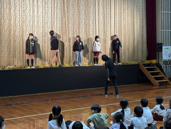 みんな大興奮 2025/11/26 インフルエンザの大流行により延期となっていた観劇が行われました。「雨降り小僧」主人公の「もうた」と妖怪の「雨降り小僧」のお話でした。児童の代表が劇の予告を朗読し、その中の1名は役者として劇にも出演しました。1年生を中心に、身を乗り出し、目を輝かせて見入っていました。年に一度の観劇ですが、お話の世界に入り込める体験はやっぱり貴重なものでした。