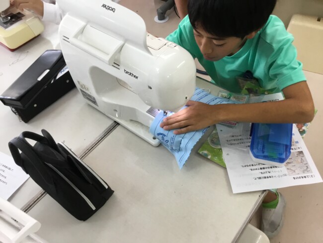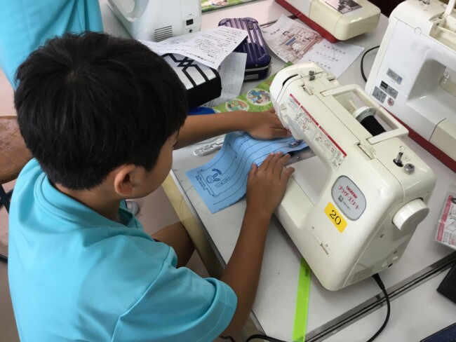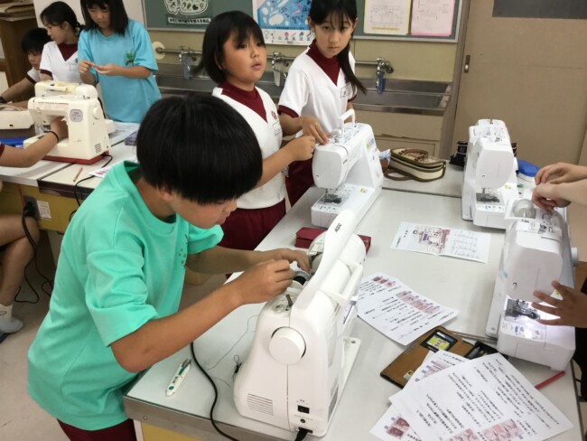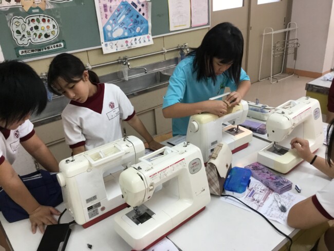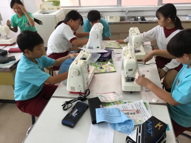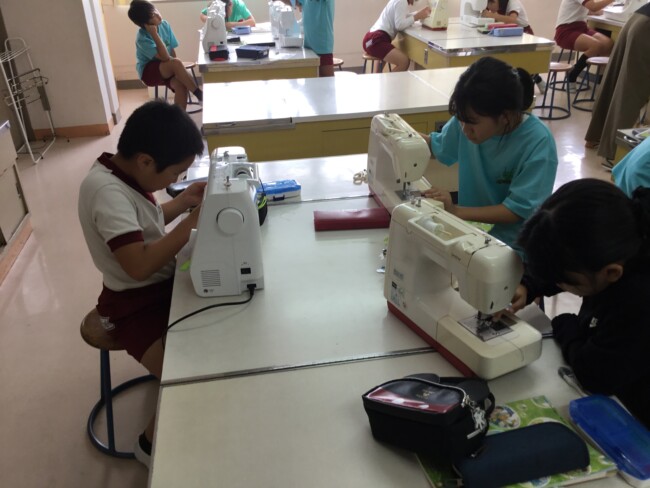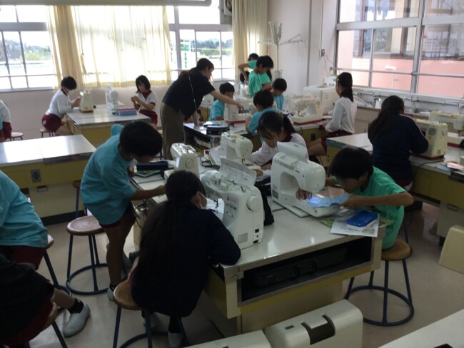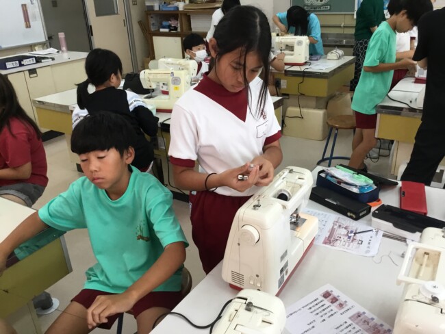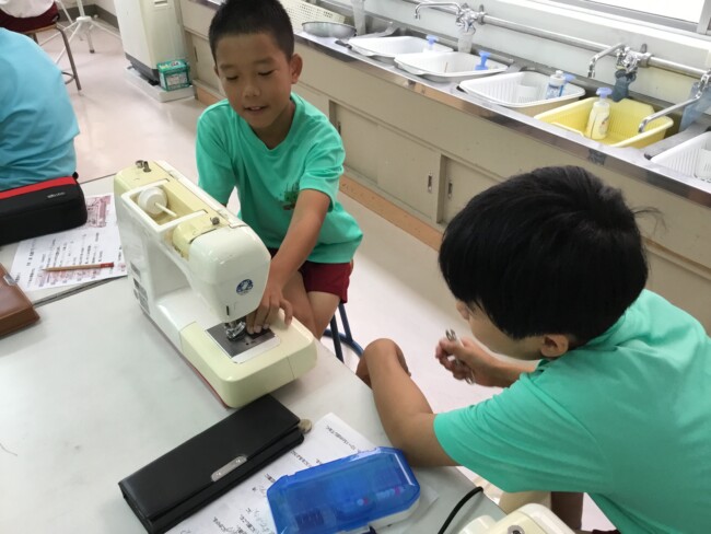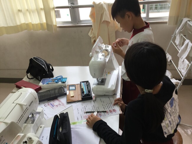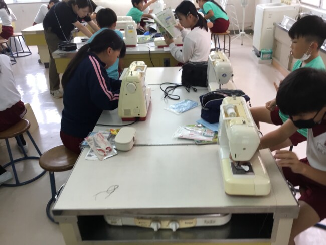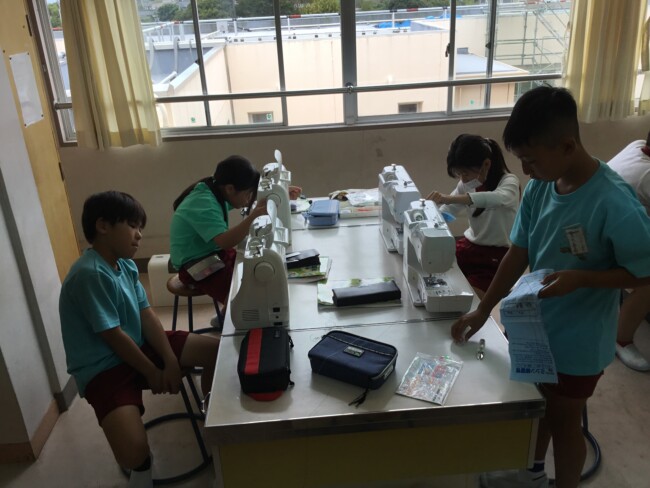 ミシンの達人になろう 2025/10/14 5年生は家庭科でミシンを使い始めました。一人に1台ミシンがあるので、みんなで一斉に取り組めます。上糸と下糸、どこにセットしどこを通すのか…。一つ一つ確かめながら、いざ! 試しの布で縫う練習をしました。