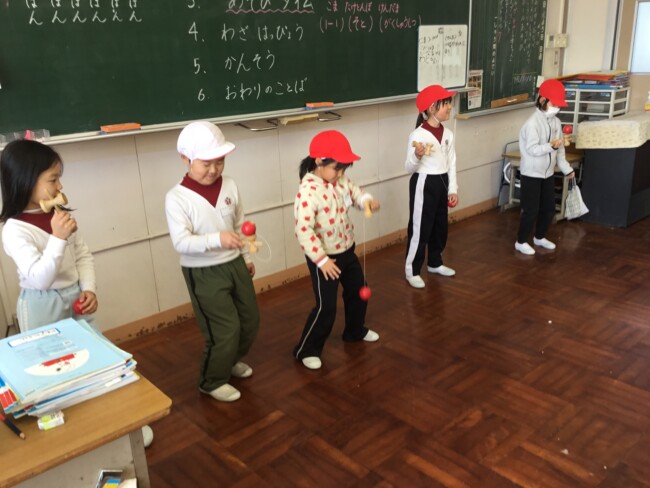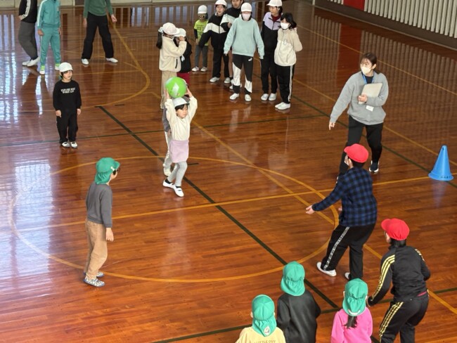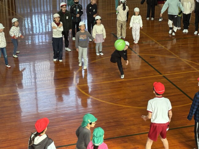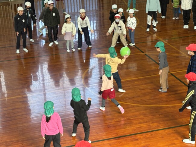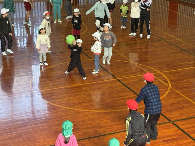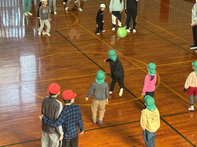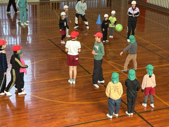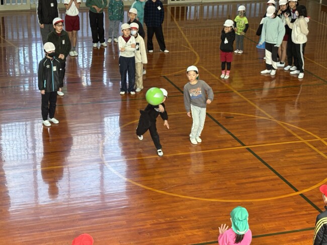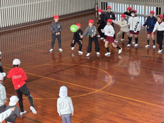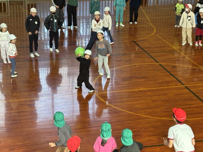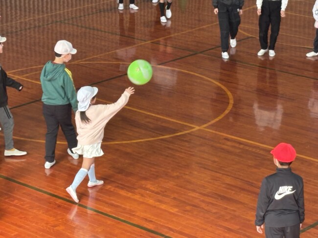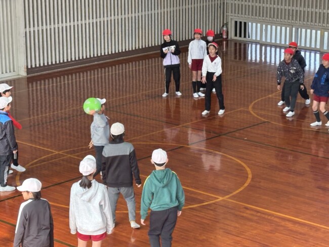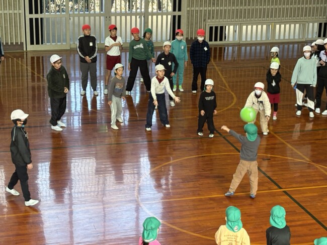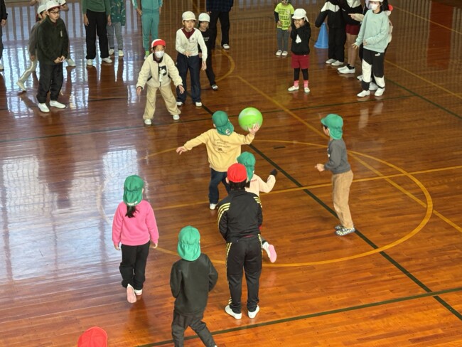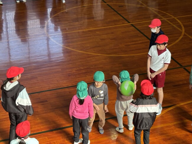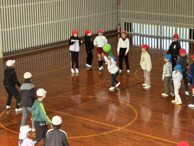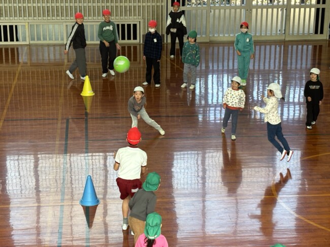 昨日は1年生の体育で行われたドッジボールの様子をお伝えしましたが、今日は「さくらこども園」の年長さんと4年生によるドッジボールの様子になります。さくらこども園さんとの交流会を定期的に実施していて、今回は東っ子タイムに4年生と交流しました。4年生からボールを受け取り、相手のコートに向かって投げたり、相手が投げたボールをキャッチしたり…。4年生が優しく接している姿が印象的でした。その後、園児は1年生とけん玉をしたり竹とんぼをしたりして楽しく交流しました。最後は1年生が得意な独楽やけん玉を園児の前で発表し、交流が終わりました。1年生、園児ともに楽しく過ごせた交流会になりました。
