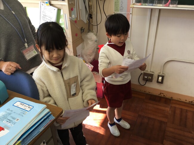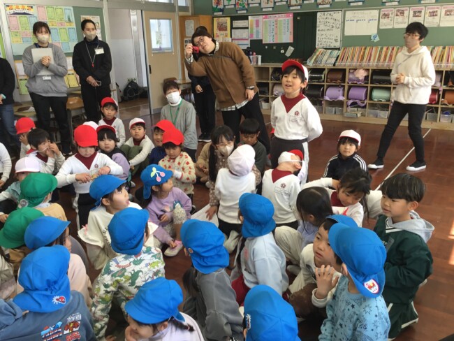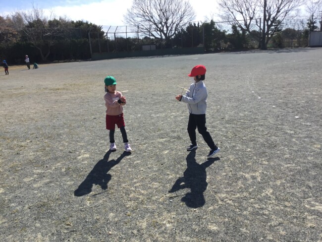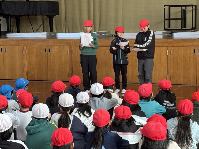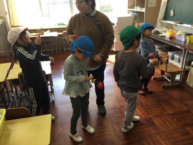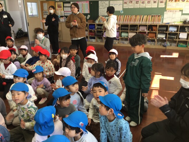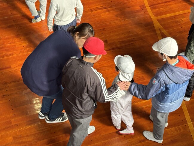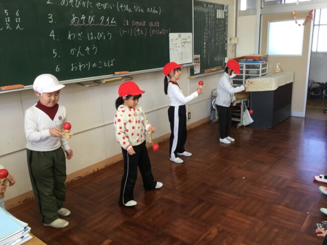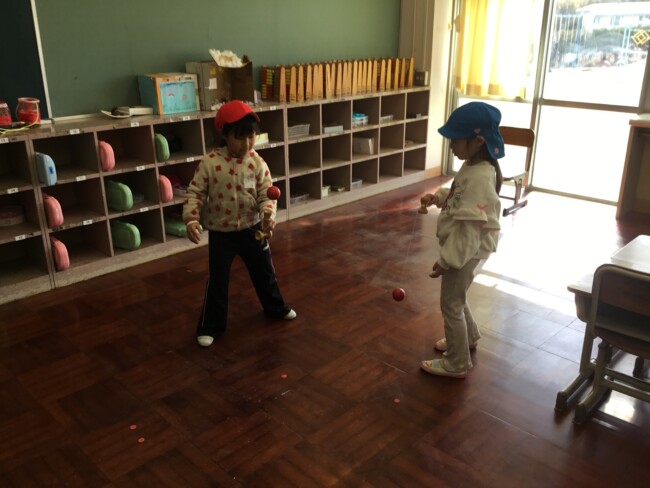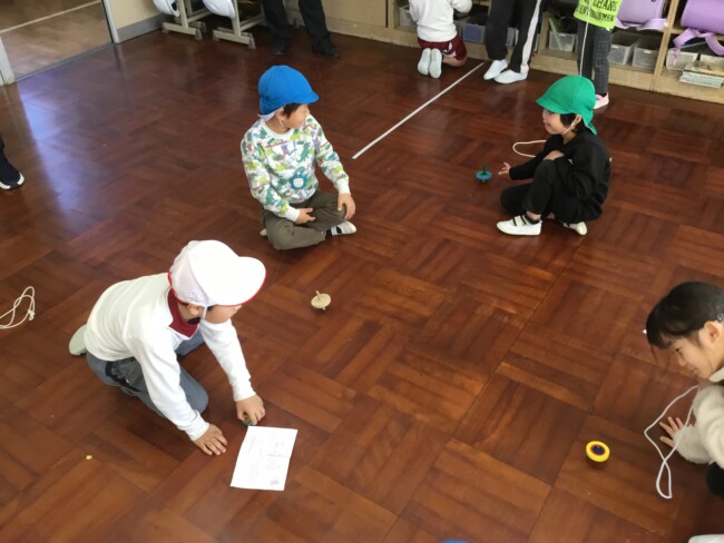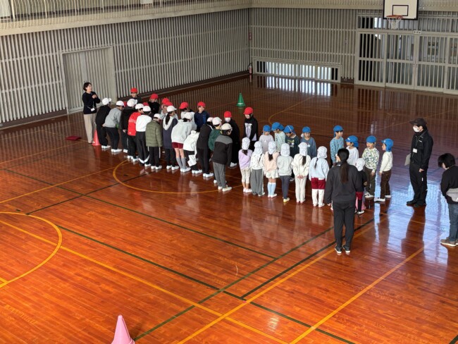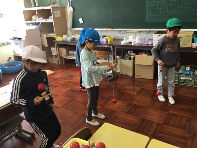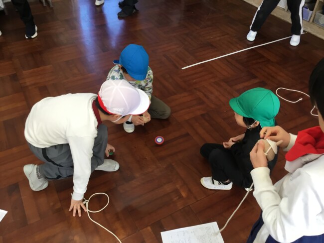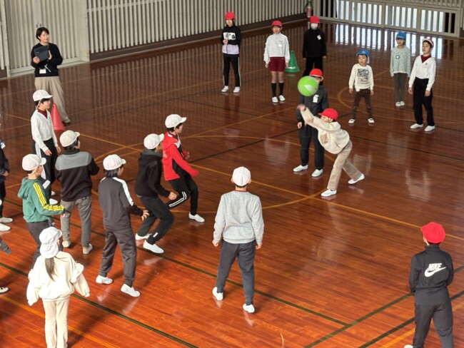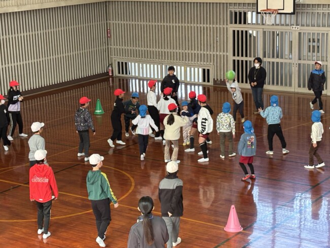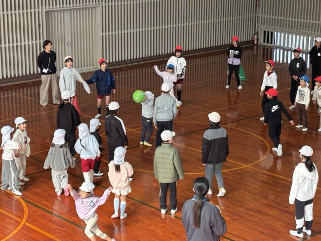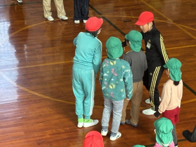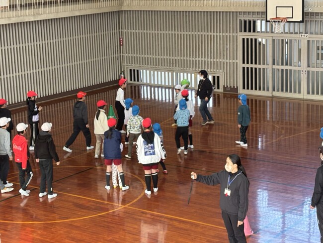 昨日は1年生の体育で行われたドッジボールの様子をお伝えしましたが、今日は「さくらこども園」の年長さんと4年生によるドッジボールの様子になります。さくらこども園さんとの交流会を定期的に実施していて、今回は東っ子タイムに4年生と交流しました。4年生からボールを受け取り、相手のコートに向かって投げたり、相手が投げたボールをキャッチしたり…。4年生が優しく接している姿が印象的でした。その後、園児は1年生とけん玉をしたり竹とんぼをしたりして楽しく交流しました。最後は1年生が得意な独楽やけん玉を園児の前で発表し、交流が終わりました。1年生、園児ともに楽しく過ごせた交流会になりました。