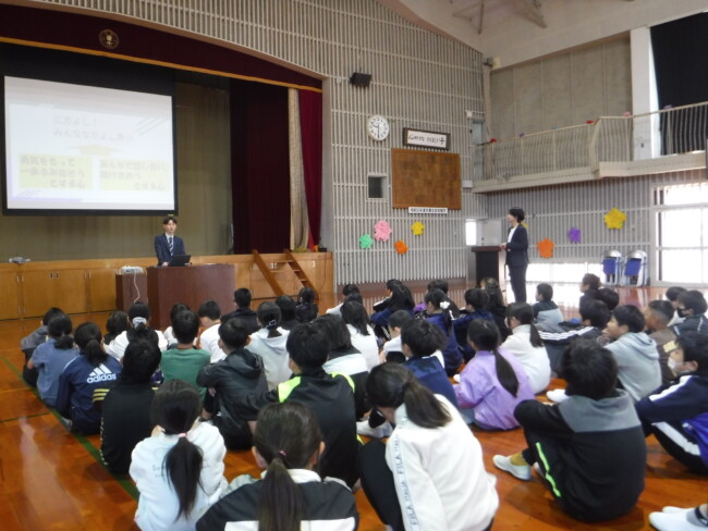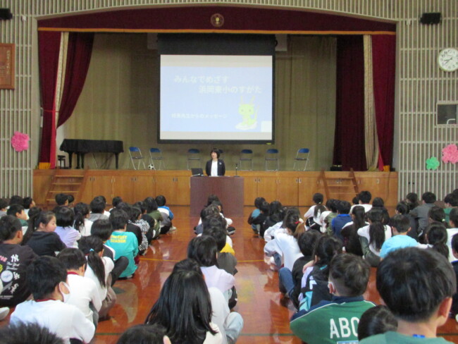 始業式では、校長先生から今年度の教育目標や重点目標をスペシャルはまりゅうのキャラクターとともに子供たちにわかりやすく伝えてくださいました。子供たちにつけたい力は「主体的行動力」「表現力」「柔軟な対応力」の3つです。「自分から考え、行動する」という6年生が考えてくれた今年度の目標に向かって全校で頑張っていきましょう!
