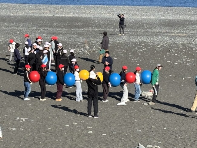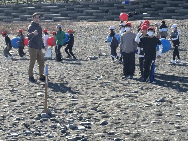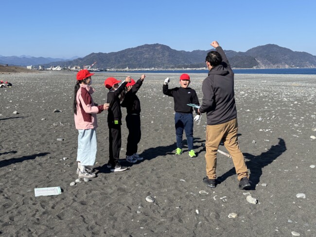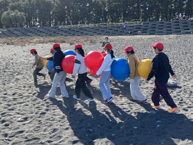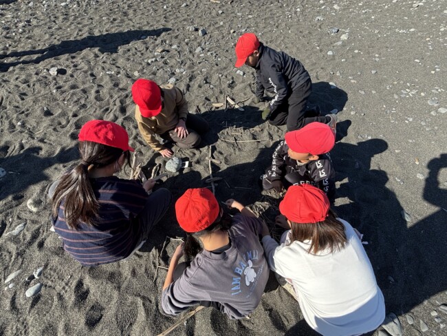 自然教室最後の活動は「チャレンジラリー」でした。風のない、あたたかな海辺で班ごと4種目に取り組みました。砂で立っている棒を埋めたり、体でボールを挟んで運ぶ種目や石を投げて棒を倒す種目…。単純ですが声をかけあい、喜びあい、和気あいあい絆を深めました。
