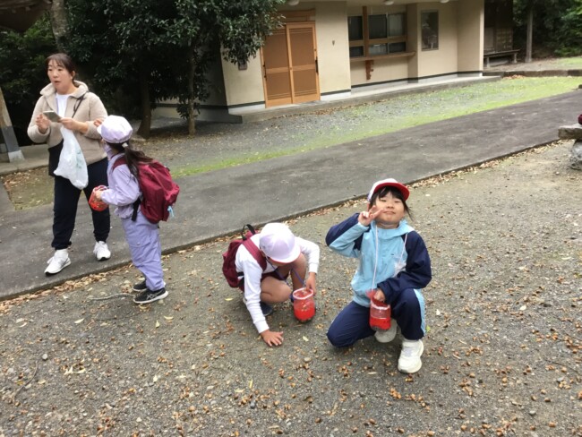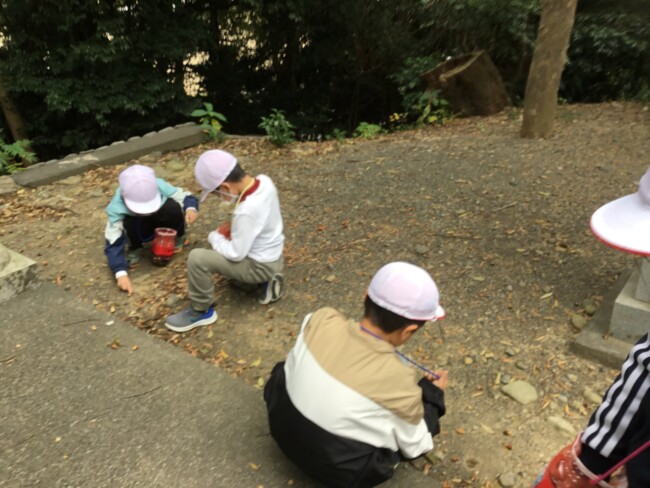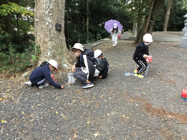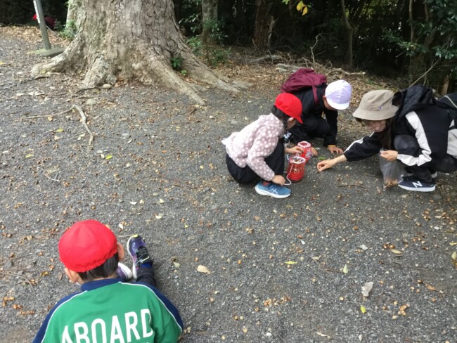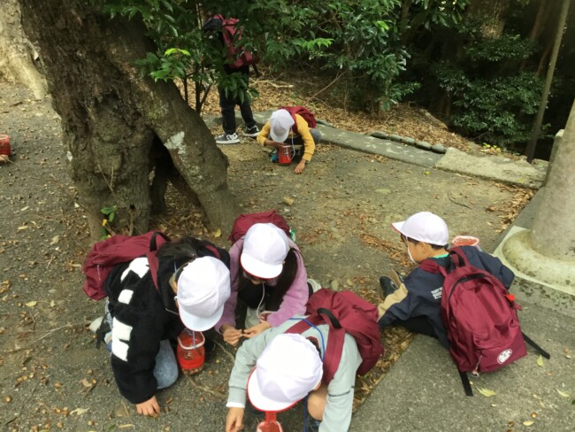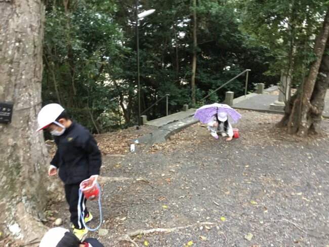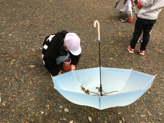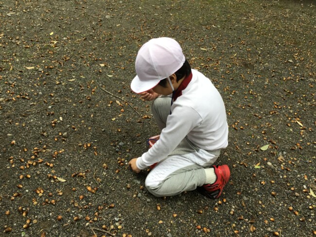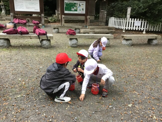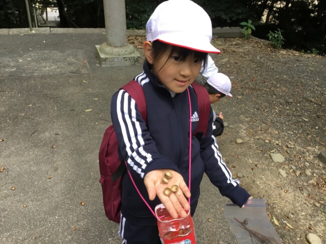 来週からは12月。秋もいよいよ深まってきました。そんな中、1年生は比企地区の賀茂神社まで「秋さがし」に行ってきました。昨日までの小春日和はどこへいってしまったのか、時々小雨が降るあいにくの天気となりましたが、それでもドングリを拾うことはできました。1年生みんなで拾っても取り切れないくらいにたくさん落ちていたドングリ…。秋がいっぱいでした。